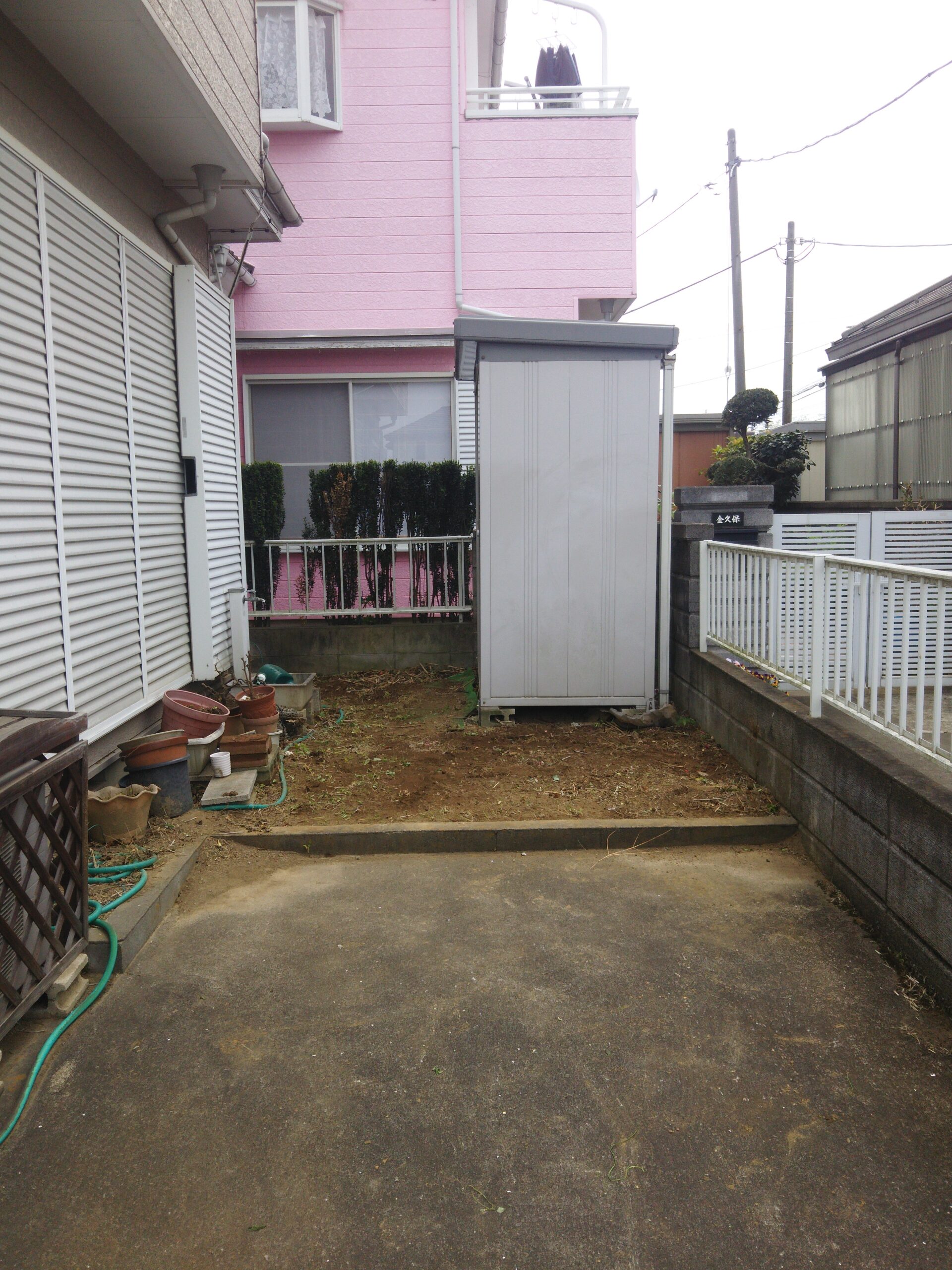 お庭の壁の際に植えていた植木を伐根いたしました。