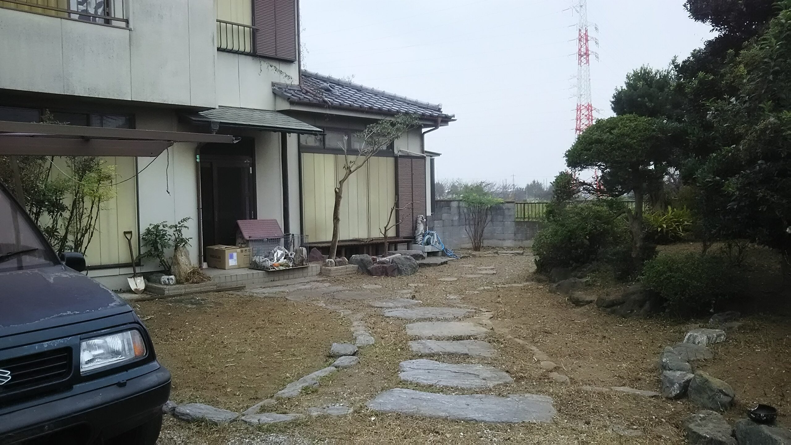 お庭に生い茂った雑草を刈り、整地、敷砂利いたしました。
