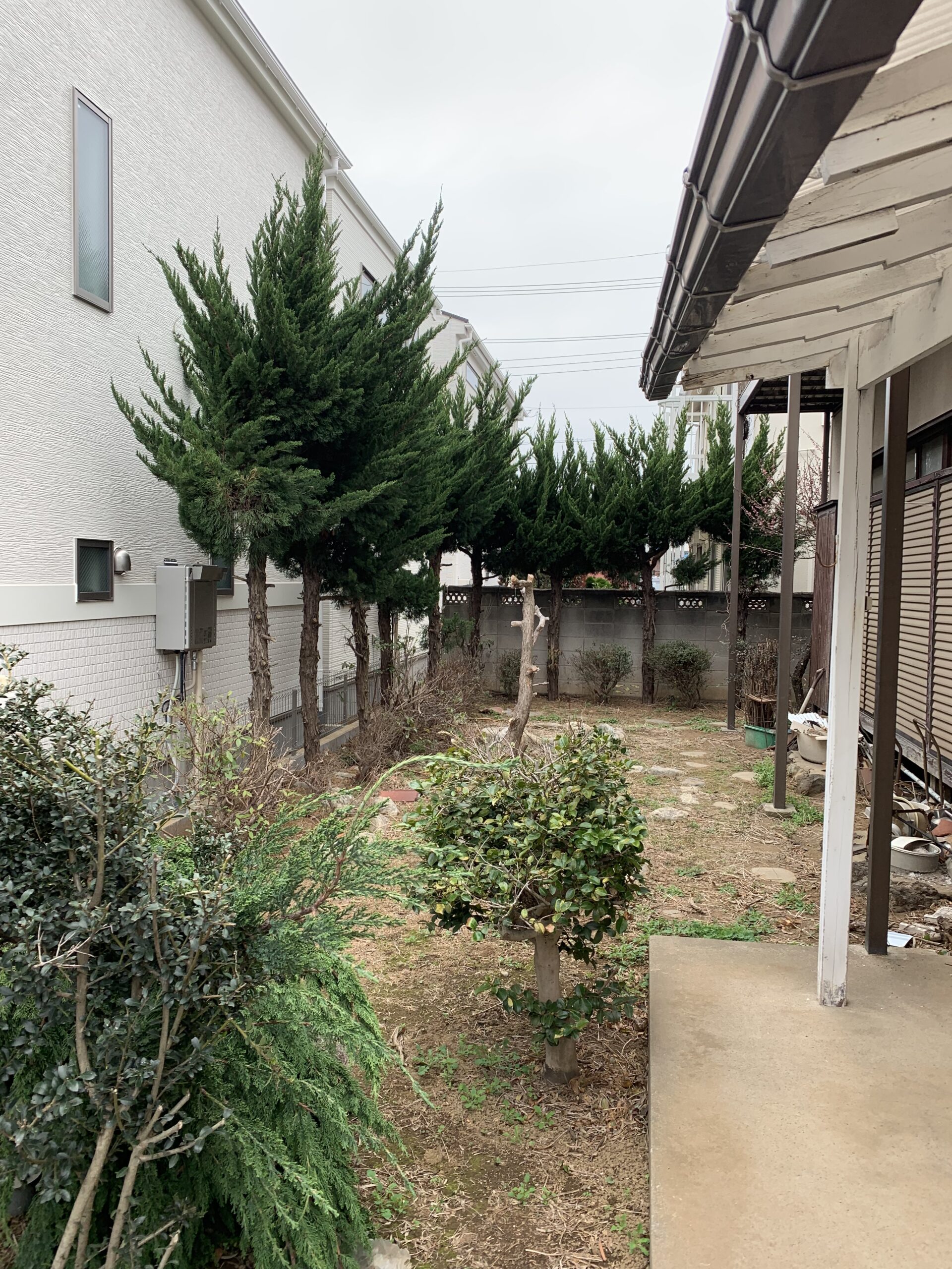 お庭の壁の際に植えていた植木を伐根いたしました。